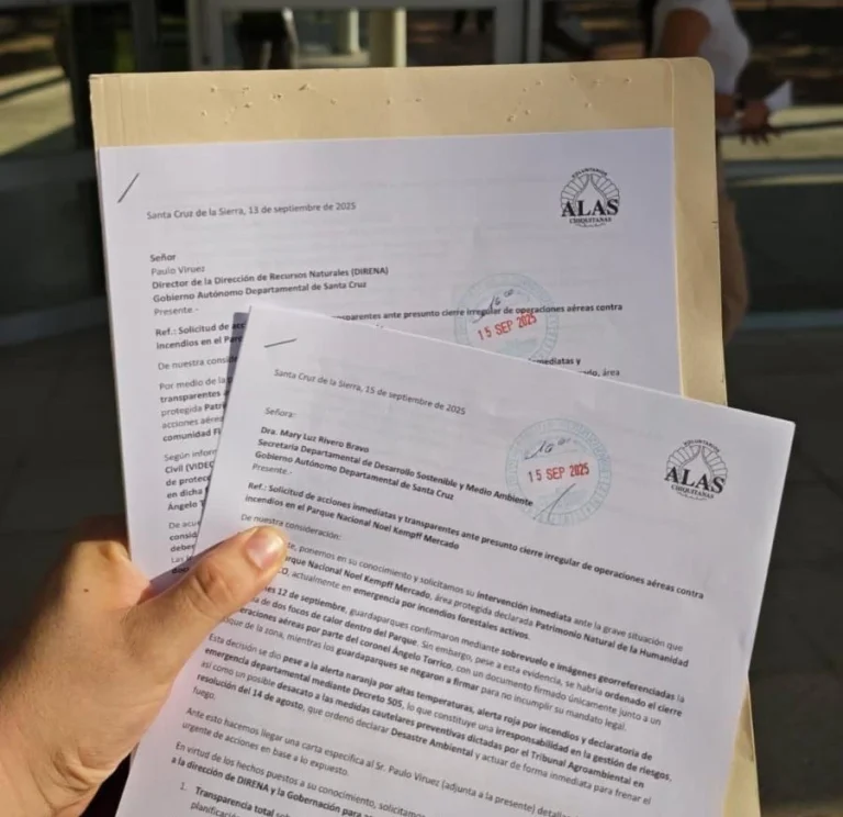 Daniela Justiniano, directora de Alas Chiquitanas Voluntarios, envió cartas a la Dirección de Recursos Naturales (DINERA) y la Secretaria Departamental de Desarrollo Sostenible y Medio Ambiente, para solicitarles acciones inmediatas y transparentes ante presunto cierre irregular de operaciones aéreas contra incendios en el Parque Nacional Noel Kempff Mercado.