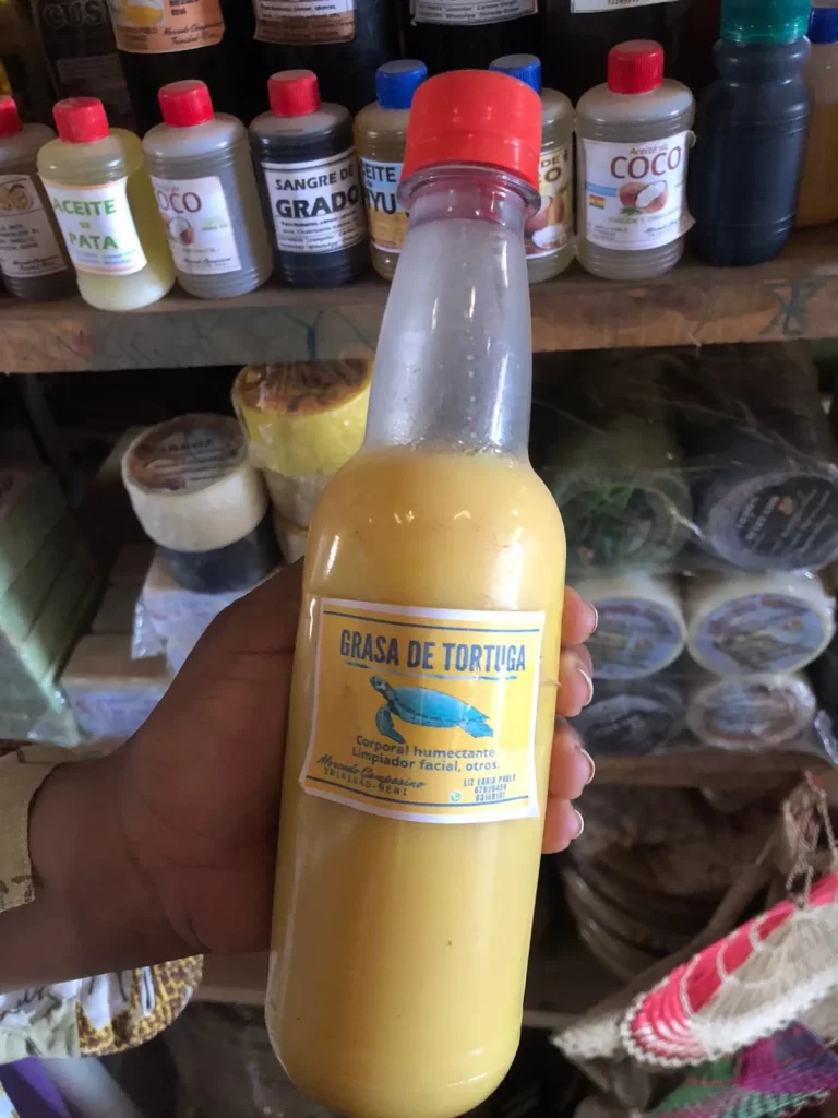 Lo que ocurre en el mundo virtual y pasa también en el presencial. Martha vende “medicinas naturales” en el mercado campesino de Trinidad. Conoce todos los beneficios de estos productos. Ahí, entre botellas plásticas, está el aceite y la grasa de tortuga. “El aceite de tortuga se puede poner al cabello, lo dejará mejor cuidado. La grasa es para la piel, es como una crema”, dice la vendedora.