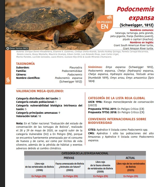 El experto añadió que, al comparar el grado de amenaza actual de las especies de tortugas con las evaluaciones previas, se observa que la tataruga y la peta de río se mantienen en la misma categoría desde 1996: En Peligro y Vulnerable, respectivamente. Pero actualmente no se tienen estudios poblacionales de tatarugas en Bolivia, de acuerdo con Domic-Rivadeneira.
