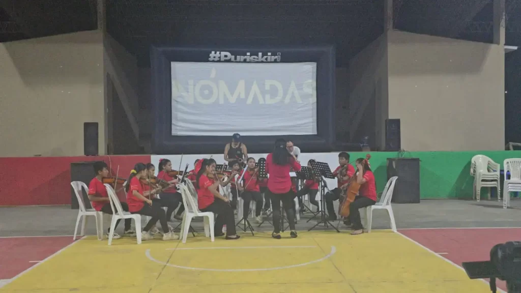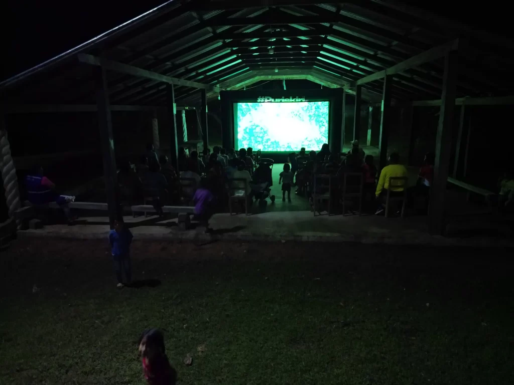 La mística del cine ambulante llegó el sábado 14 de marzo a la comunidad indígena Cruz del Norte. Allí, bajo la pantalla inflable de Nómadas convocó a todos los vecinos. No hubo distinciones: desde los ancianos que atesoran en su piel la memoria del bosque antiguo, hasta los niños y adolescentes que miraban con ojos asombrados la inmensidad de su propio hogar proyectada con una nitidez desgarradora. La convocatoria fue total, un encuentro intergeneracional donde el silencio solo era interrumpido por los sonidos de la selva que rodeaba el evento, fundiéndose con la atmósfera sonora del documental.