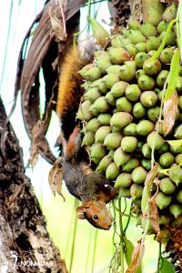 Una ardilla busca su alimento en una planta de motacú, en la zona de Aguas Calientes.