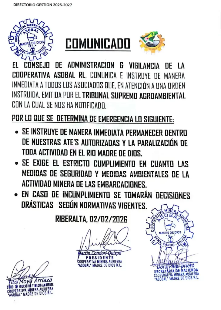 Mediante un comunicado oficial emitido desde Riberalta el 2 de febrero de 2026, el Consejo de Administración y Vigilancia de la Cooperativa ASOBAL RL instruyó a todos sus asociados la paralización inmediata de toda actividad en el río Madre de Dios. Esta determinación de emergencia, obligó a los mineros a permanecer estrictamente dentro de sus Áreas de Trabajo Minero (ATE’S) autorizadas. El documento, firmado por la directiva de la cooperativa, exigió, además el cumplimiento riguroso de las medidas de seguridad y ambientales para todas las embarcaciones, advirtiendo que se tomarán decisiones drásticas bajo la normativa vigente en caso de cualquier incumplimiento.