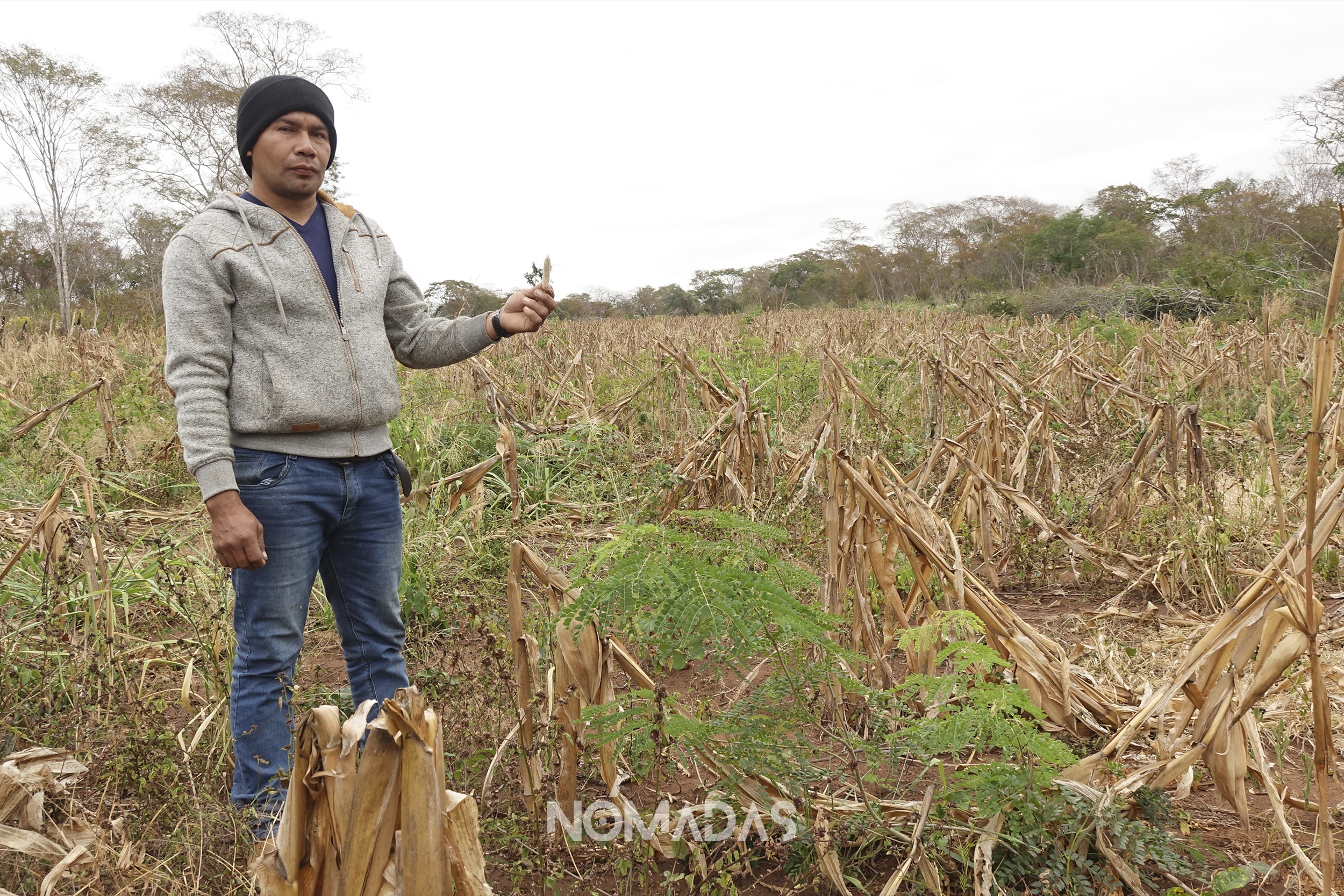 Julio César Chonaca Campos, muestra cómo la sequía afecto su campo de cultivo de maíz en la Comunidad de San Francisco. Foto: © WWF-Bolivia / Revista Nómadas.