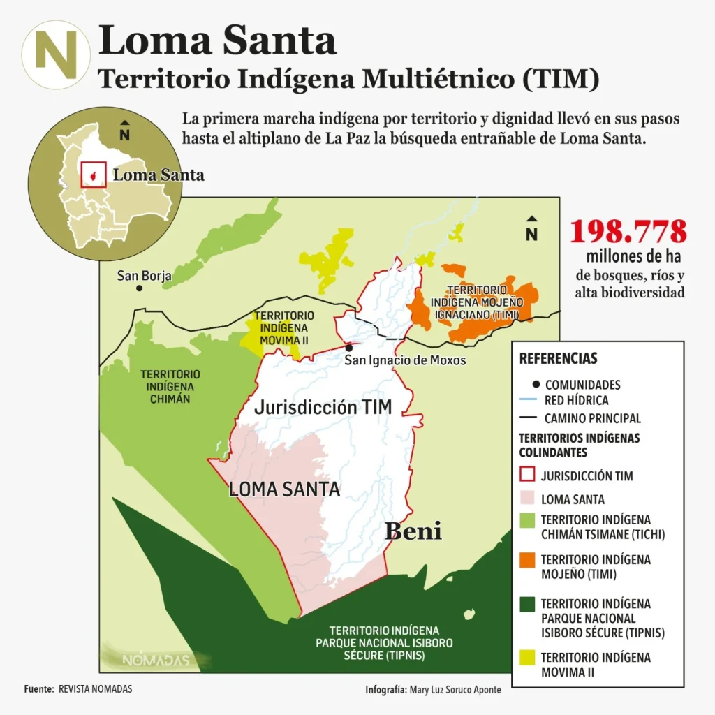El TIM, recordó, reúne unas 28 comunidades con cerca de 4.000 personas. Dentro de Loma Santa, viven nueve comunidades t`simanes y, en el borde, tres mojeñas: once en total que mantienen una relación directa con el área de conservación. Para ellas, Loma Santa simboliza lo mismo que para sus abuelos, un paraíso ancestral, sin enfermedades, con abundancia de alimentos y sin dueños que impongan cadenas. Un bosque sano, capaz de proveer todo lo necesario, es la imagen misma de ese lugar soñado.