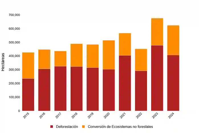 Como indicado antes, en términos de deforestación, 2024 marcó un nuevo hito, con 407 080 hectáreas transformadas, consolidándose como el segundo valor más alto en los registros disponibles. En paralelo, la conversión de ecosistemas no boscosos alcanzó 216 518 hectáreas, lo que constituye un récord histórico absoluto.