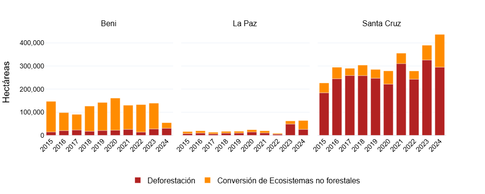 Históricamente, la conversión de ecosistemas no boscosos, como sabanas, pastizales y humedales, ha estado concentrada en el departamento de Beni, que llegó a representar más del 60% del total nacional en algunos años. Sin embargo, en 2024, su contribución fue limitada (11,0%), mientras que Santa Cruz lidera con el 65,5%, seguido por La Paz (17,7%), Cochabamba (3,8%), Tarija (0,9%) y Pando (0,6%).