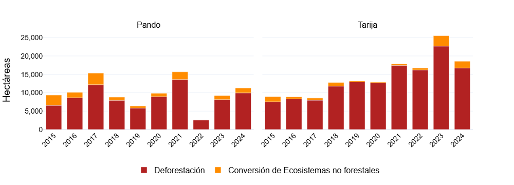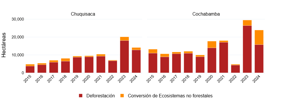 - Sumando ambas, la transformación total de ecosistemas naturales en 2024 equivale a 1,7 veces la superficie del departamento de Tarija.
