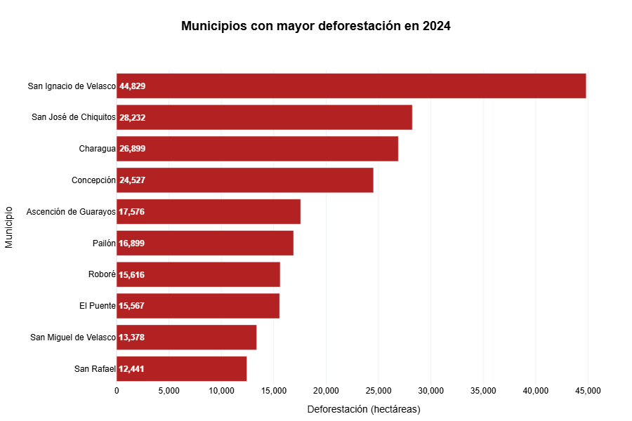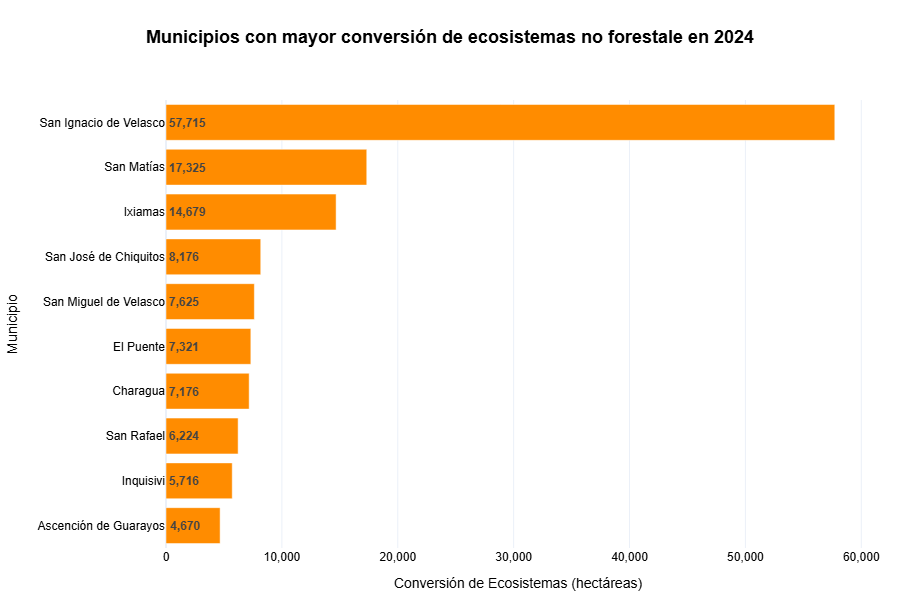 La transformación ecológica observada en 2024 no se distribuye de forma homogénea en el territorio boliviano. Por el contrario, tiende a concentrarse en un grupo reducido de municipios donde la presión sobre los ecosistemas naturales es particularmente intensa.