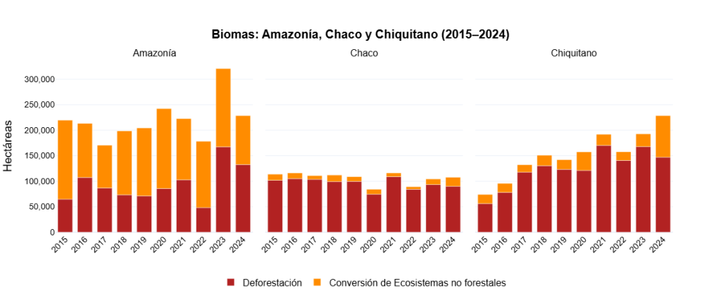 No obstante, en 2024 se observó un cambio inusual. La conversión en el bioma Amazonía se redujo de forma notable a 95.000 hectáreas, mientras que en el bioma Chiquitano se registró un incremento abrupto, alcanzando las 80.000 hectáreas. Este desplazamiento podría reflejar en el caso del bioma Chiquitano la apertura de nuevas fronteras de conversión de ecosistemas no boscosas y en el caso del bioma amazónico, la sustitución de una parte de la conversión de ecosistemas no boscosos por bosques. Sin embargo, más análisis son necesarios para indicar aquello con certeza