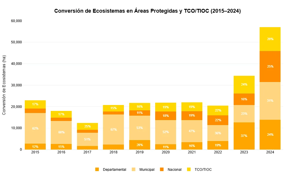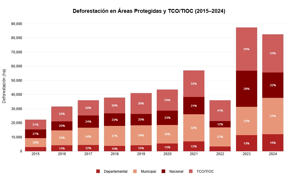 Pese a su rol teórico como instrumento de conservación, en la última década se ha observado un crecimiento sostenido en los niveles de deforestación dentro de estas categorías. Desde niveles inferiores a las 20.000 hectáreas anuales, en los últimos dos años se ha producido un aumento considerable. En 2024, la deforestación registrada dentro de APs y TCOs/TIOCs superó las 80.000 hectáreas, lo que representa aproximadamente un 20 por ciento del total nacional. Este último dato debe interpretarse con cautela, ya que considera superposiciones entre ambas categorías. Por lo tanto, en algunos casos una misma superficie puede haber sido contabilizada más de una vez, lo que puede sobreestimar el peso relativo de estas áreas en la deforestación total.