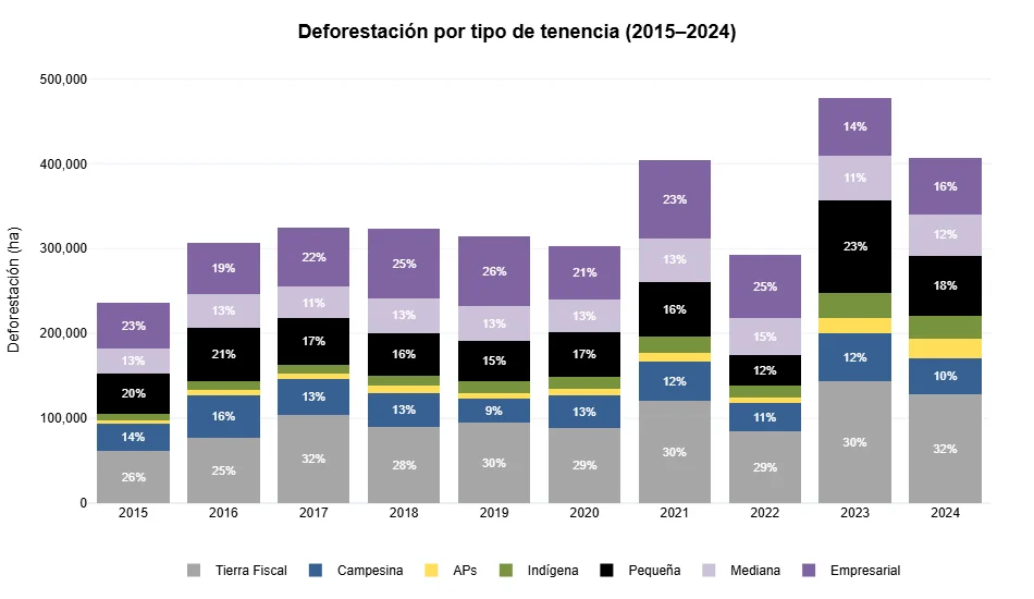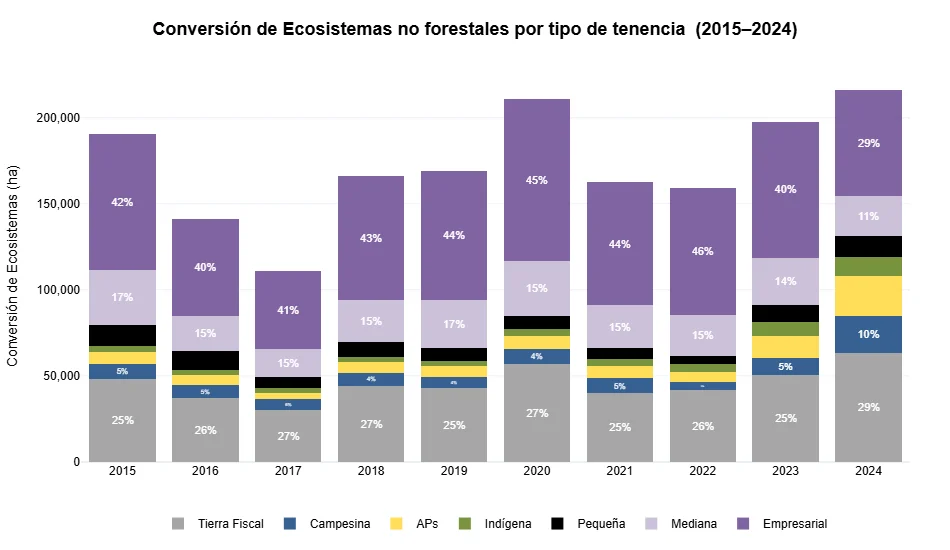 Con esto dicho, resulta particularmente llamativa la evolución del aporte de las distintas categorías de tenencia a la deforestación a lo largo del tiempo. Hasta 2022, la deforestación estuvo mayoritariamente concentrada en propiedades medianas y empresariales, mientras que en 2023 y 2024 se observa un aumento notable en la contribución de la pequeña propiedad. A lo largo de toda la década analizada, la tierra fiscal también ha jugado un papel significativo, con niveles de deforestación persistentes. En cuanto a la conversión de ecosistemas no boscosos, destacan de forma consistente los altos niveles registrados en tierras empresariales y medianas, así como en propiedad fiscal.