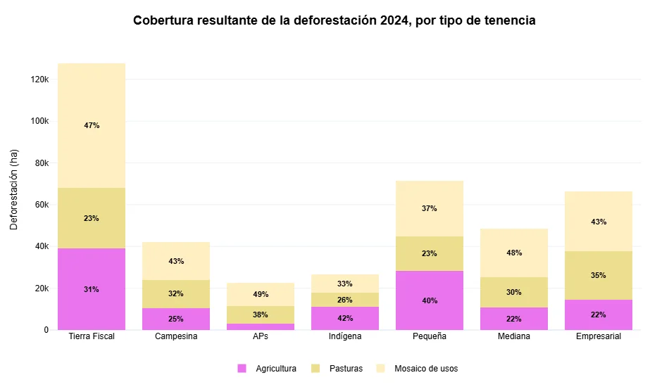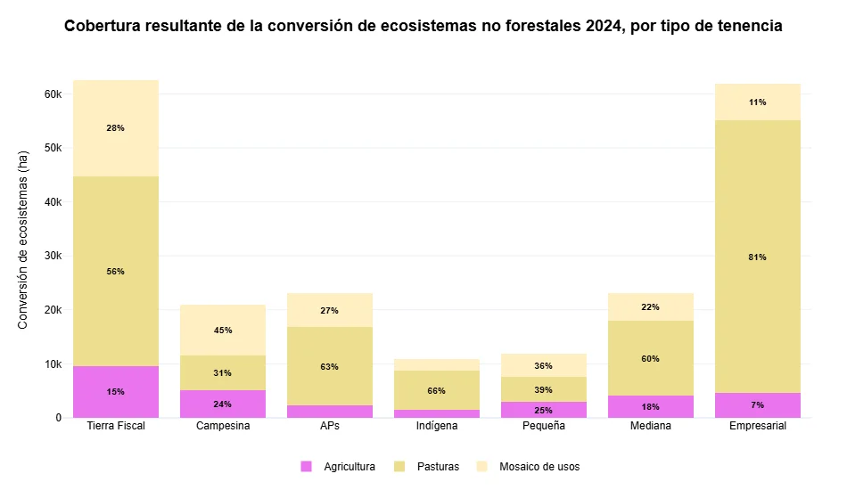 Este desglose refuerza la hipótesis de que la expansión de la frontera agropecuaria continúa siendo el principal motor estructural de la transformación de ecosistemas naturales en el país, con variaciones entre regiones y tipos de propiedad.